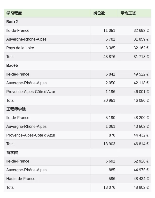 综合而言,Bac+2的学生在卢瓦尔河地区找到工作机会的可能性比较高,Bac+5毕业生或是工程师院校在就业集中地区外,还可以在Provence-Alpes-Côted'Azur找到一些岗位,因为该地区电信、数字、能源等行业企业较多。