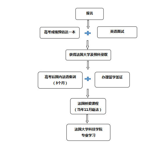 高三学生可以报名申请ADIUT中国区高中生项目,填报法国大学志愿,每年3月或4月份参加法国大学校方面试,面试合格的学生5月份获得ADIUT有条件录取,高考成绩达到一本线,7月份获得法国大学理工学院正式录取。